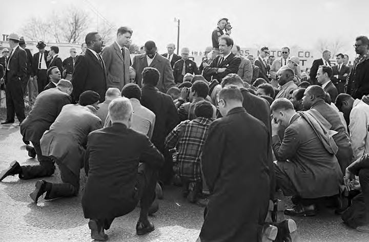Marchers kneel in prayer at the second civil rights march in Selma
