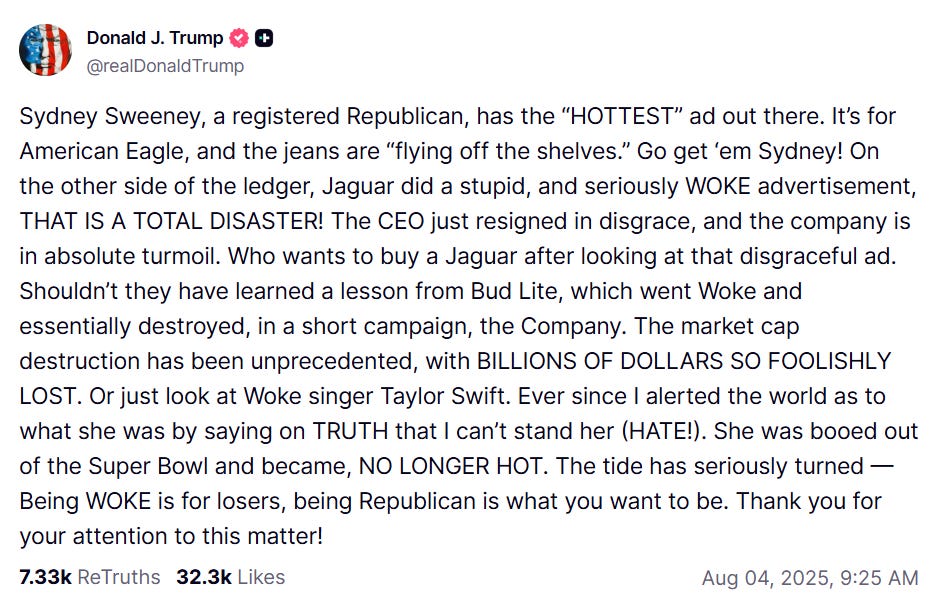 By taking to social media to share a steady stream of AI-generated patriotic art, hostility toward celebrities (Taylor Swift and Tom Hanks), and input on pointless controversies, Trump is intent on taking the whole cultural pie. He won’t win every argument — calls to revert the Washington Commanders and Cleveland Guardians to their former names have yet to be successful, and the Smithsonian issue is still unfolding. But by involving himself in the day-to-day viral moments that many would think beneath the concern of the POTUS, Trump has pulled off a vibe shift: Woke is out. Non-woke is in. “The tide has seriously turned," as Trump declared on social media about American Eagle’s Sweeney campaign.