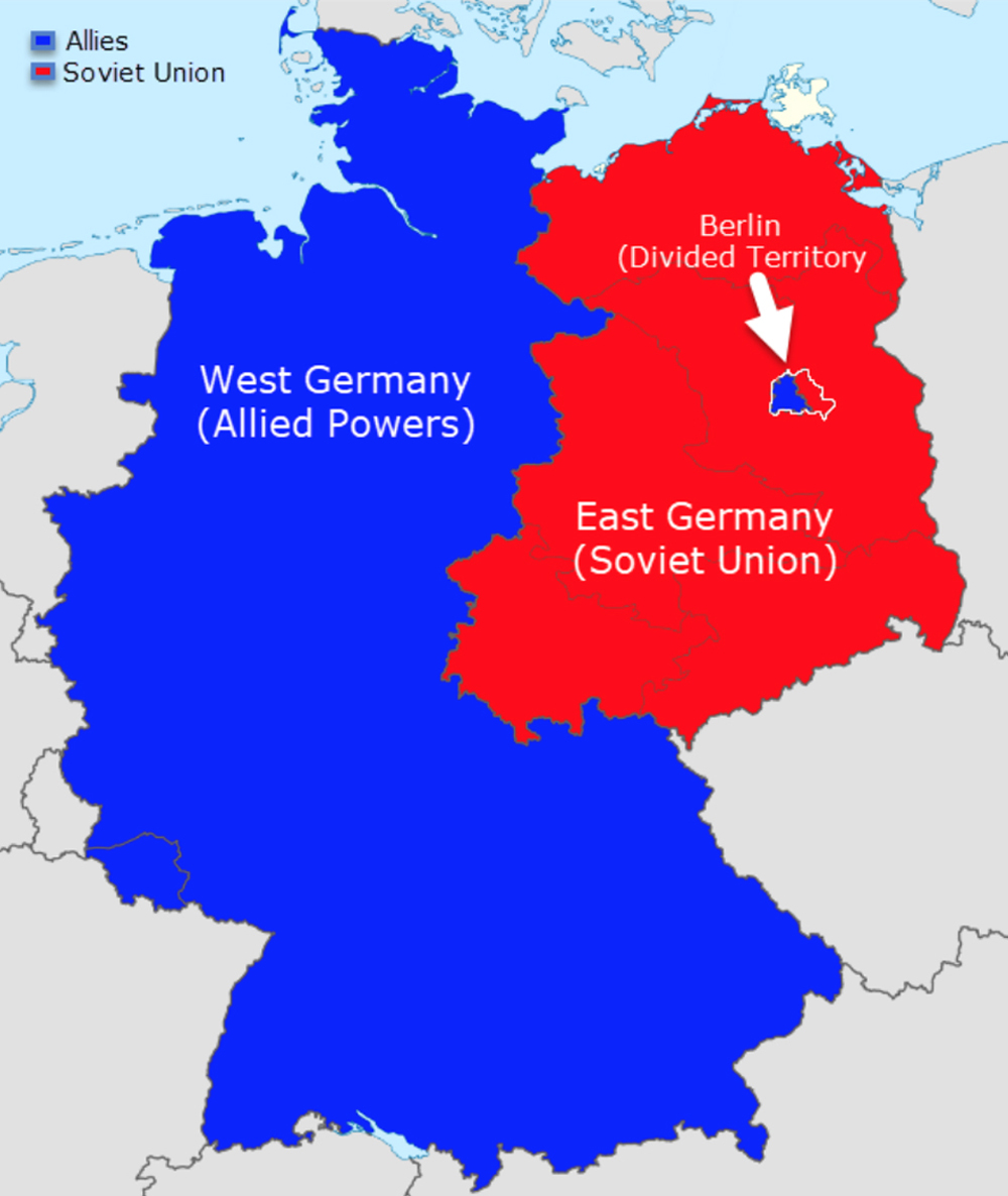 So the decision was made to split Germany into two regions – the area under control of the West became known as the Federal Republic of Germany, or West Germany, and the area known as the German Democratic Republic, or East Germany, would remain under the Soviets.