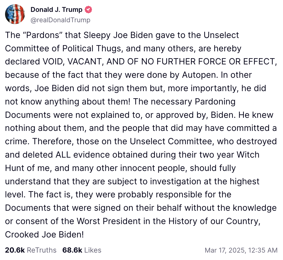 Essentially, Trump is making two claims. First, he says Biden didn’t even sign the pardons himself, but instead used a device called an autopen.