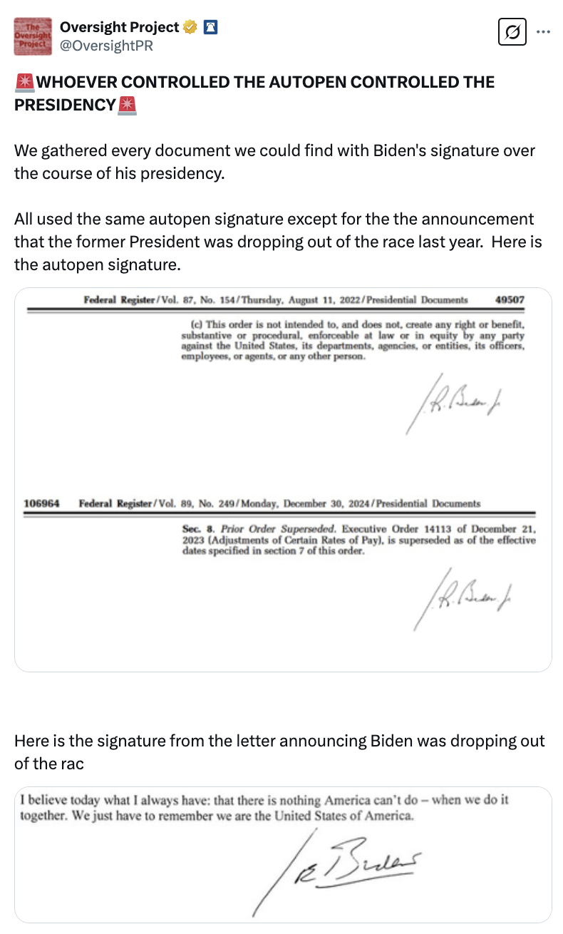The Oversight Project also said they had gathered every document they could find with Biden’s signature throughout his presidency and found that all of them used the same autopen signature, except for one: the announcement that the former president was dropping out of the race last year.