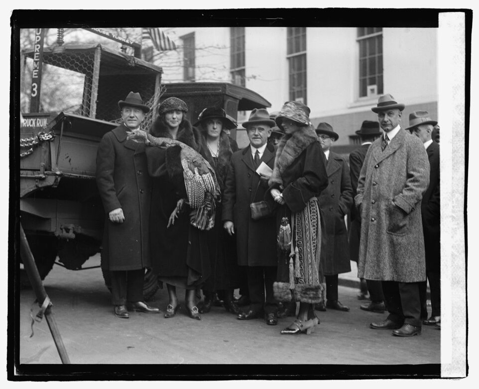 The Harding Girls’ Club sent turkeys to the president wherever he was. One year, the president was on his way to Panama to visit the Panama Canal and they sent a turkey named John Gobbler. The next year the turkey flew on a plane with a military guard wearing an aviator costume including a helmet, goggles, and a sweater coat.