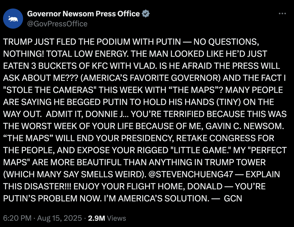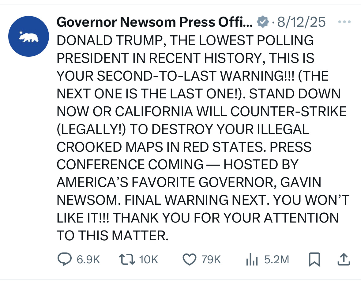 The first, on August 12, read: “DONALD TRUMP, THE LOWEST POLLING PRESIDENT IN RECENT HISTORY, THIS IS YOUR SECOND-TO-LAST WARNING!!! (THE NEXT ONE IS THE LAST ONE!) STAND DOWN NOW OR CALIFORNIA WILL COUNTER-STRIKE (LEGALLY!) TO DESTROY YOUR ILLEGAL CROOKED MAPS IN RED STATES. PRESS CONFERENCE COMING — HOSTED BY AMERICA’S FAVORITE GOVERNOR, GAVIN NEWSOM. FINAL WARNING NEXT. YOU WON’T LIKE IT!!! THANK YOU FOR YOUR ATTENTION TO THIS MATTER.”