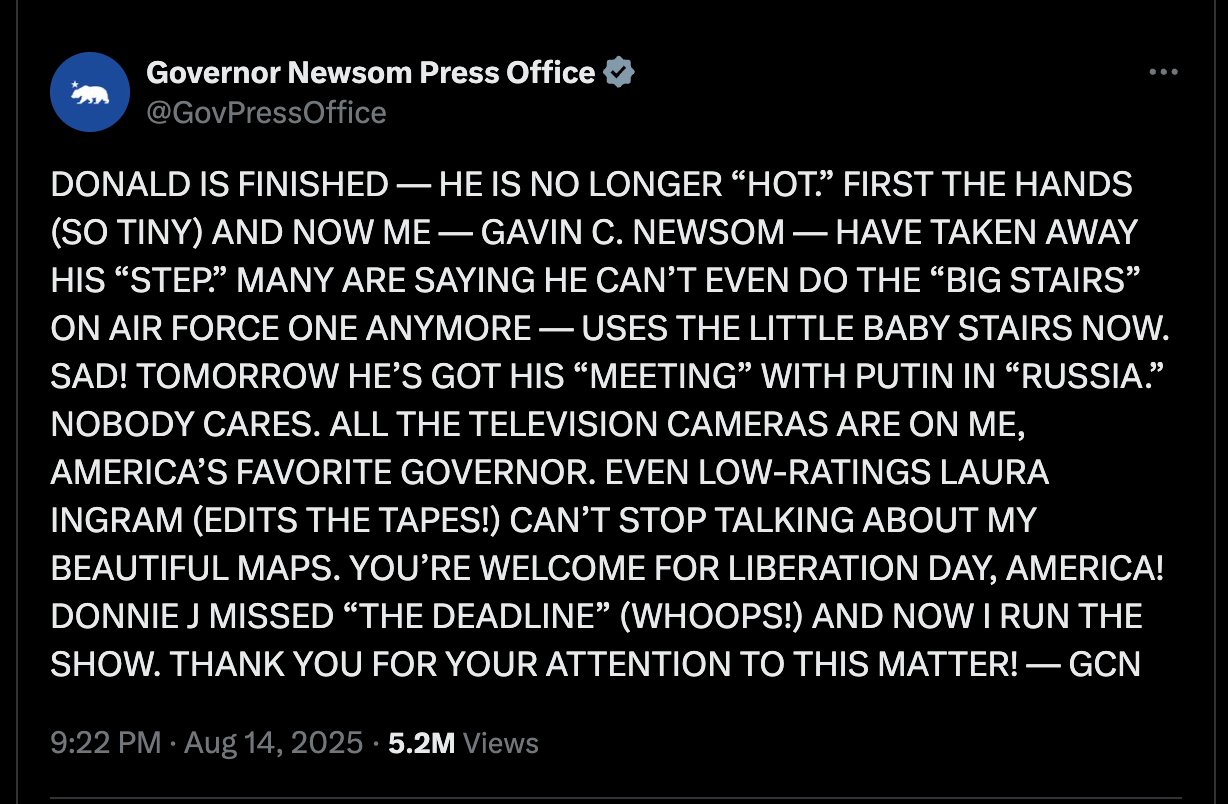 In a recent post on X, California Governor Gavin Newsom’s Press Office account wrote, “DONALD IS FINISHED — HE IS NO LONGER ‘HOT.’ FIRST THE HANDS (SO TINY) AND NOW ME — GAVIN C. NEWSOM — HAVE TAKEN AWAY HIS ‘STEP.’ MANY ARE SAYING HE CAN’T EVEN DO THE ‘BIG STAIRS’ ON AIR FORCE ONE ANYMORE — USES THE LITTLE BABY STAIRS NOW. SAD!” He continued, “ALL THE TELEVISION CAMERAS ARE ON ME, AMERICA’S FAVORITE GOVERNOR.”