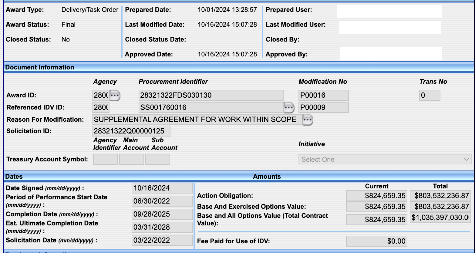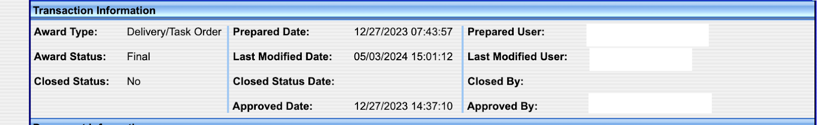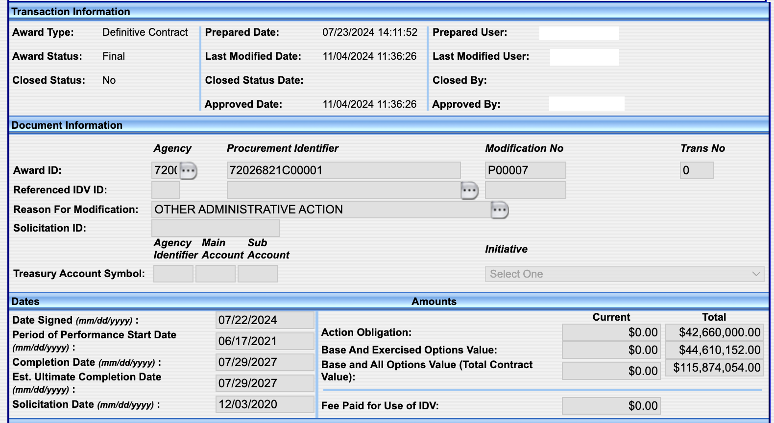 When you click on the DOGE receipt, you see the image below. The last time this contract was modified was in October, during the Biden administration. There is no indication here that it has been closed or canceled.