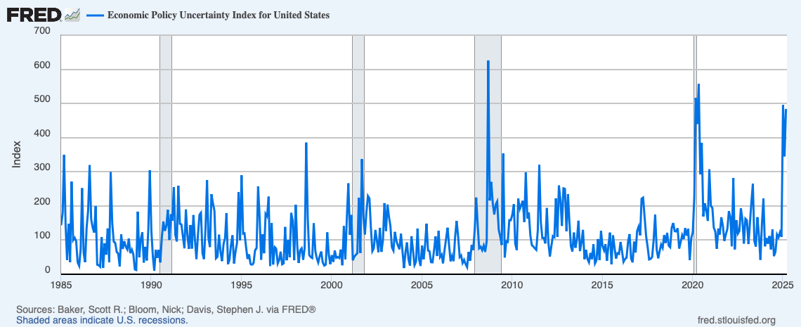 According to an index tabulated by the Federal Reserve branch in St. Louis, economic policy uncertainty is currently higher in the U.S. than at any point since Covid — and since the 2008 recession before that. (“Recession” is yet another word on some economists’ lips right now. But, be warned: Economists are very bad at predicting recessions.)