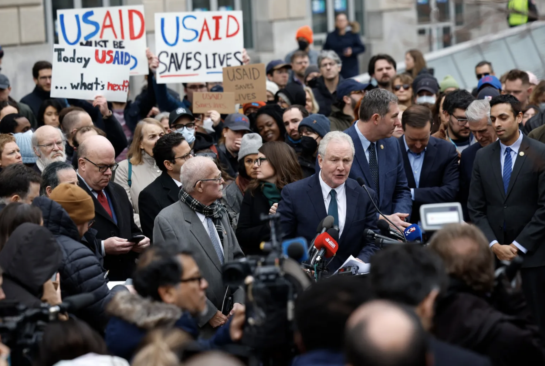 Nearly a dozen representatives joined Sens. Murphy, Chris Van Hollen, and Brian Schatz outside of the headquarters. Schatz has said he will hold up all of Trump’s nominees for the State Department until USAID is "functional" again.