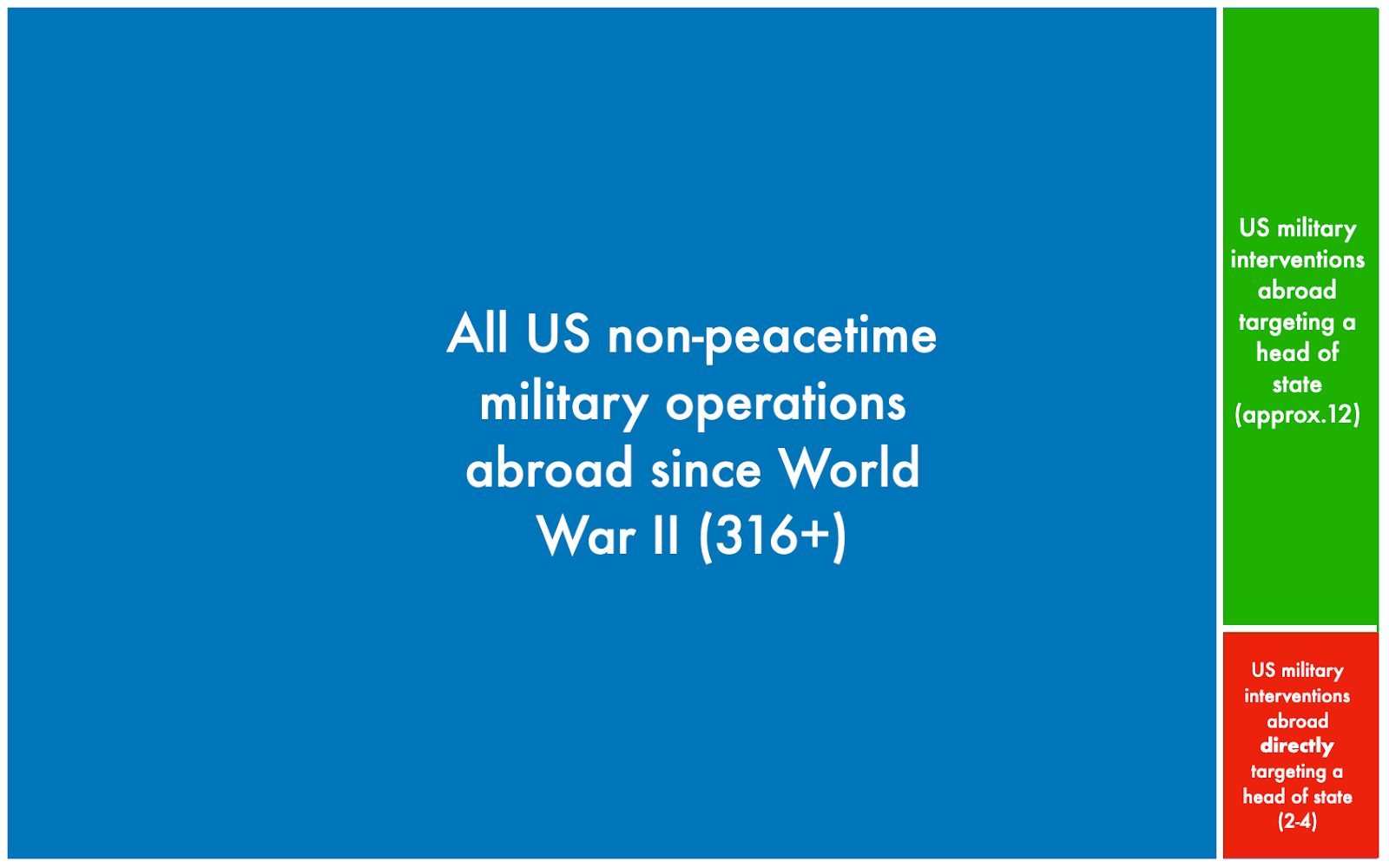 Just using the first two criteria doesn’t narrow things down much: according to a 2023 congressional report, the US Armed Forces have been used abroad in 316 non-peacetime instances since the end of WWII (with the number even higher if we include 2024, 2025, and these very busy early days of 2026).