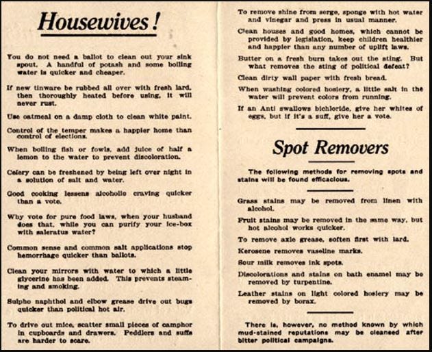The same NAOWS pamphlet that argued married women had no need to vote also combined household tips with its anti-suffrage agitation: “Why vote for pure food laws, when your husband does that, while you can purify your ice-box with saleratus water?” it asked, referencing a baking soda mixture used for cleaning. The pamphlet included plenty of other nudges for women to focus on the household and the health of their families and leave the politics to the men, like these helpful hints: “You do not need a ballot to clean out your sink spout. A handful of potash and some boiling water is quicker and cheaper… Clean houses and good homes, which cannot be provided by legislation, keep children healthier than any number of uplift laws.”
