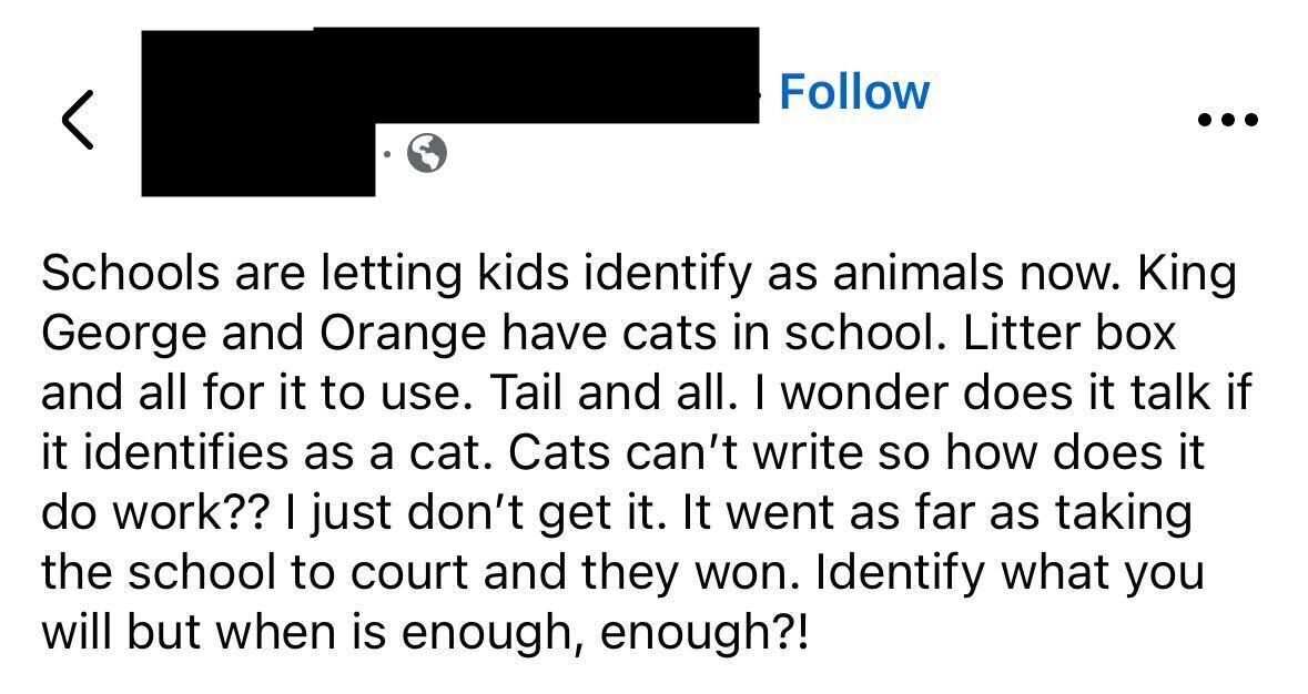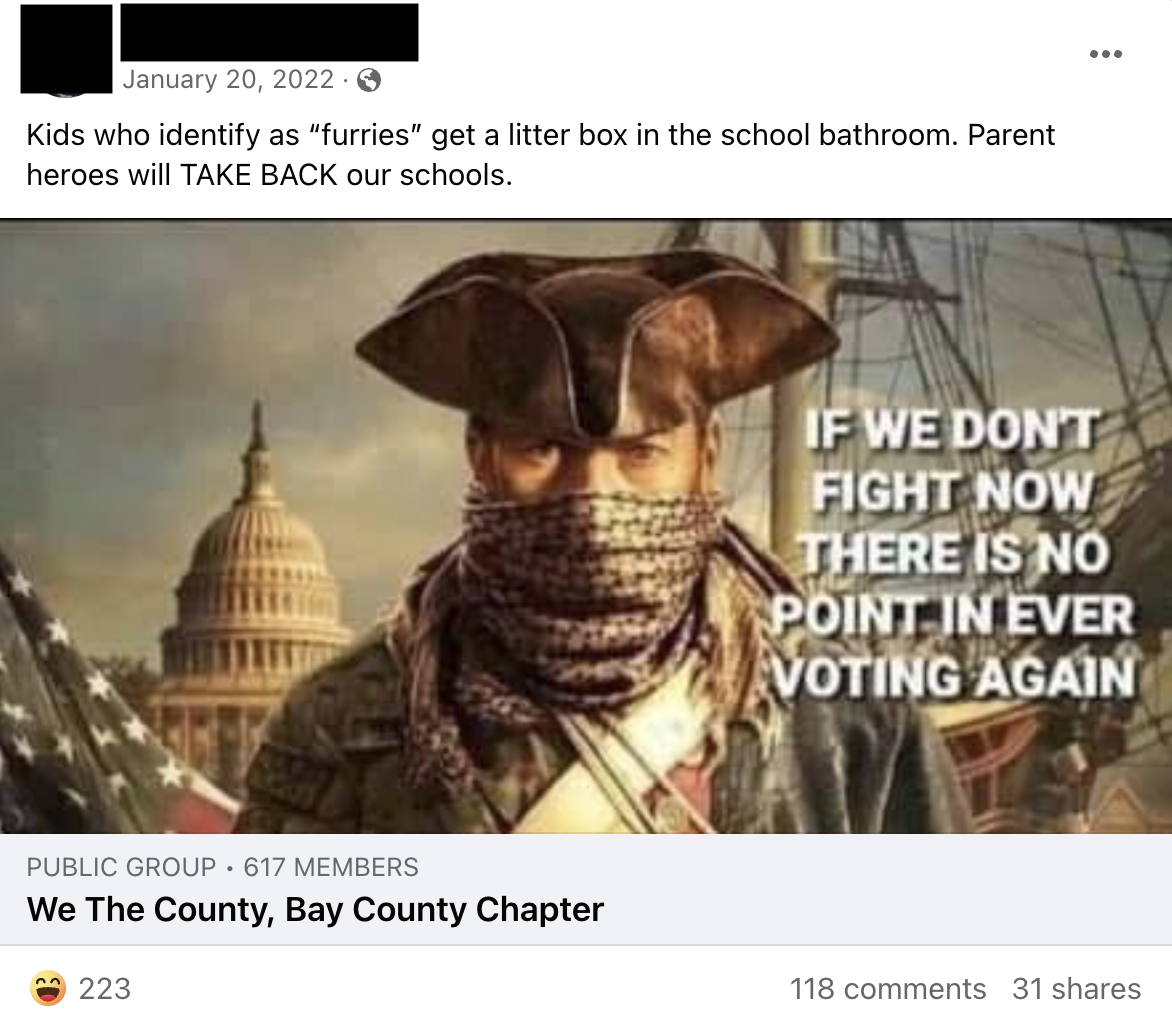 A few weeks after Hansen made her statement at the board meeting, another person shared a video of Hansen’s speech on Facebook with the caption: “Kids who identify as ‘furries’ get a litter box in the school bathroom. Parent heroes will TAKE BACK our schools.”