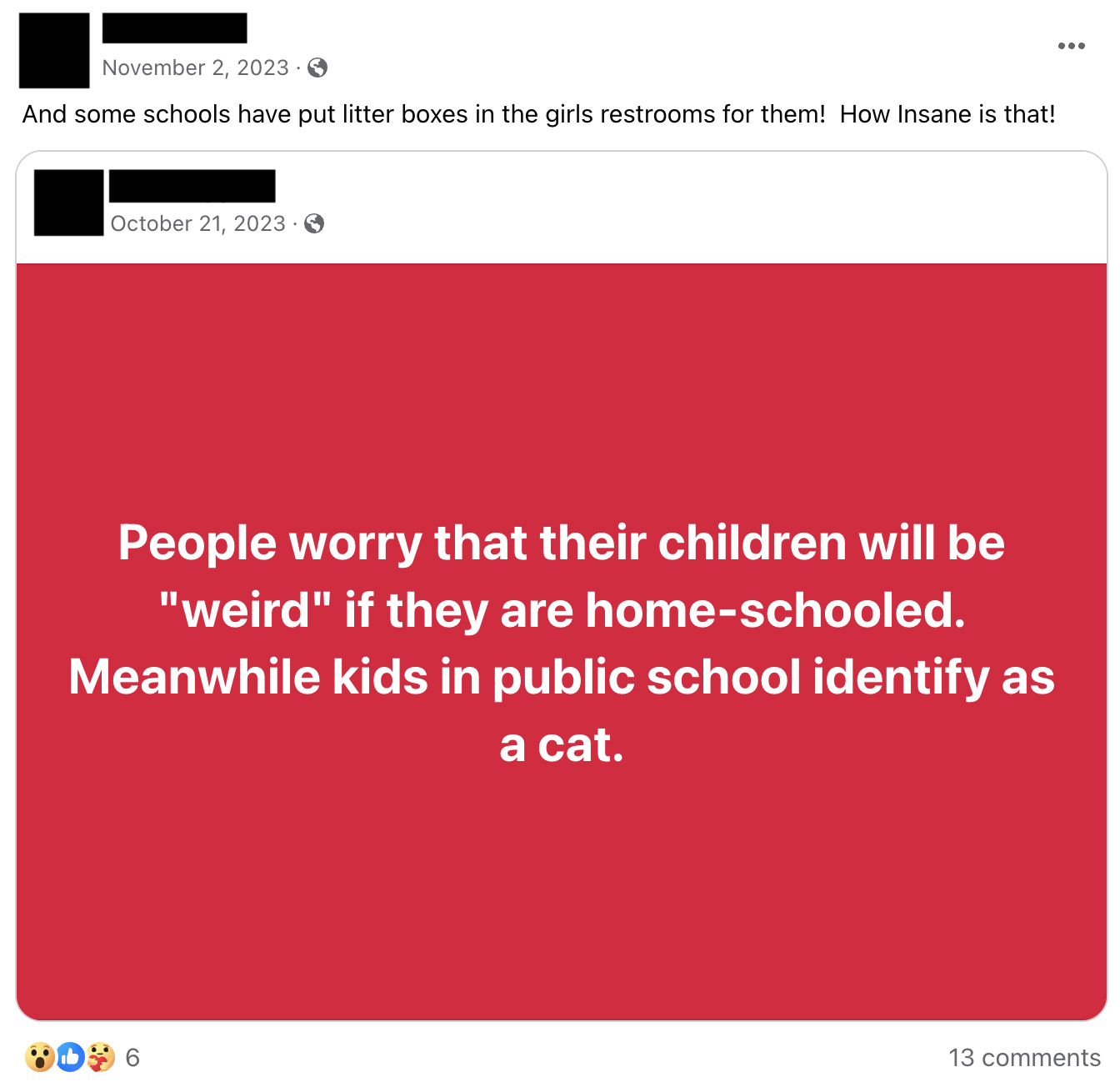 As 2022 wore on, more politicians started picking up the rumor. Three lawmakers in Minnesota said they’d heard that students were cutting holes in uniforms so they could use litter boxes at school. A school board member in Fargo, North Dakota, a gubernatorial candidate in CO, an Iowa state senator, and a member of the Ohio State Board of Education all spread claims that litter boxes were being used in schools in their state.