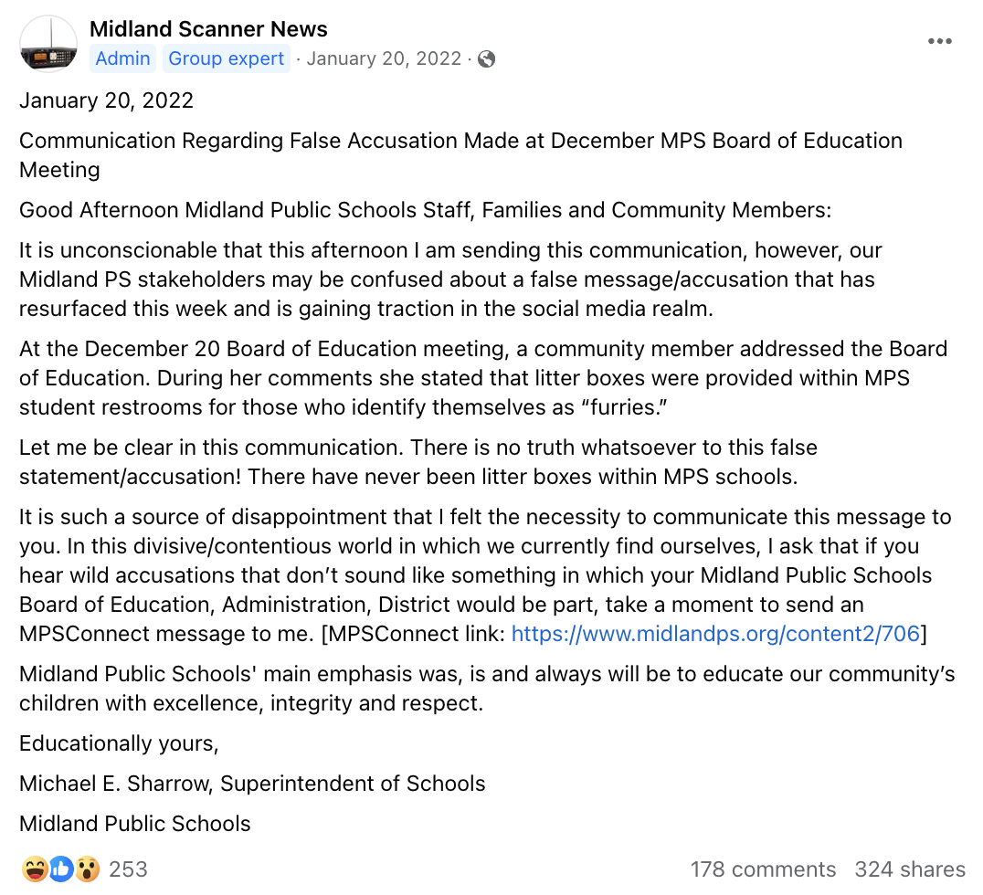 But the rumors didn’t stop. Angry parents posted about litter boxes online, and hundreds of thousands of people shared false information, even as school district after school district reiterated: this is simply untrue. Unequivocally, no, we do not do that.