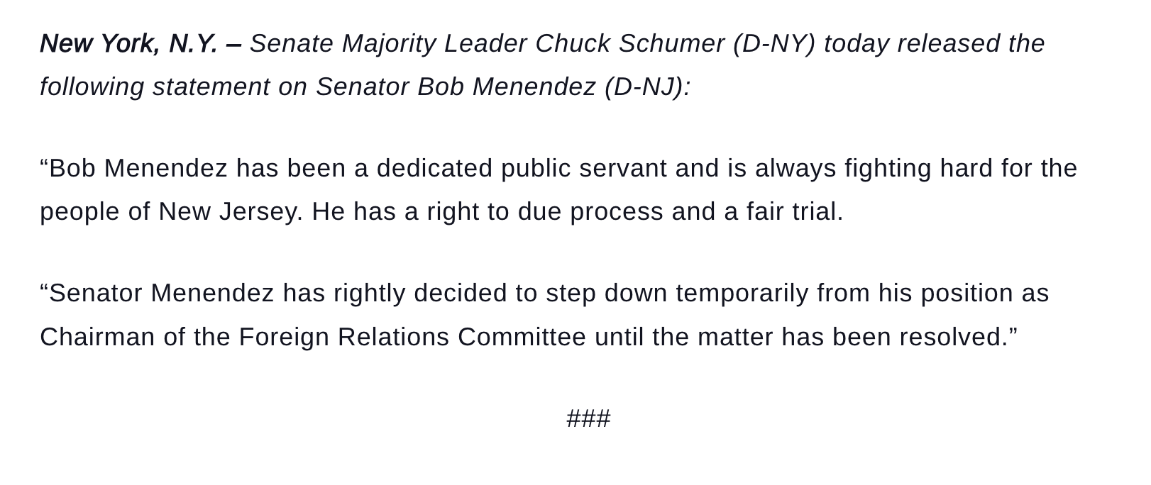 Here is the entirety of Chuck Schumers’s statement on Bob Menendez: