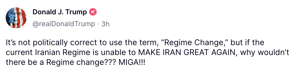 “It’s not politically correct to use the term ‘Regime Change,’ but if the current Iranian regime is unable to MAKE IRAN GREAT AGAIN, why wouldn’t there be Regime change? MIGA!!!”