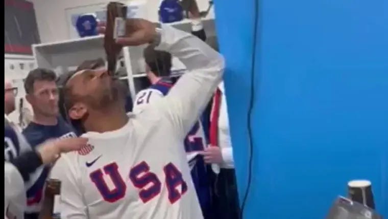 The FBI Director can be seen inside the men’s locker room, chugging a beer and spraying its remnants in the air, while fist pumping, banging his hand on a table, and wearing a gold medal.