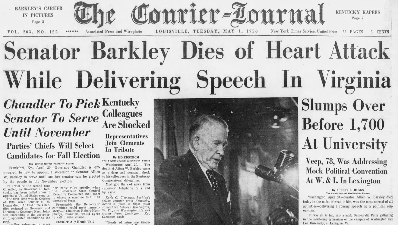 On April 30, 1956, Barkley was nearing 80. He’d been back in the Senate for a year. And he was still the kind of speaker who knew how to whip up a crowd, despite his advanced age. He took the stage at Washington and Lee University, speaking confidently into the bank of microphones, some of which were broadcasting live on the radio.