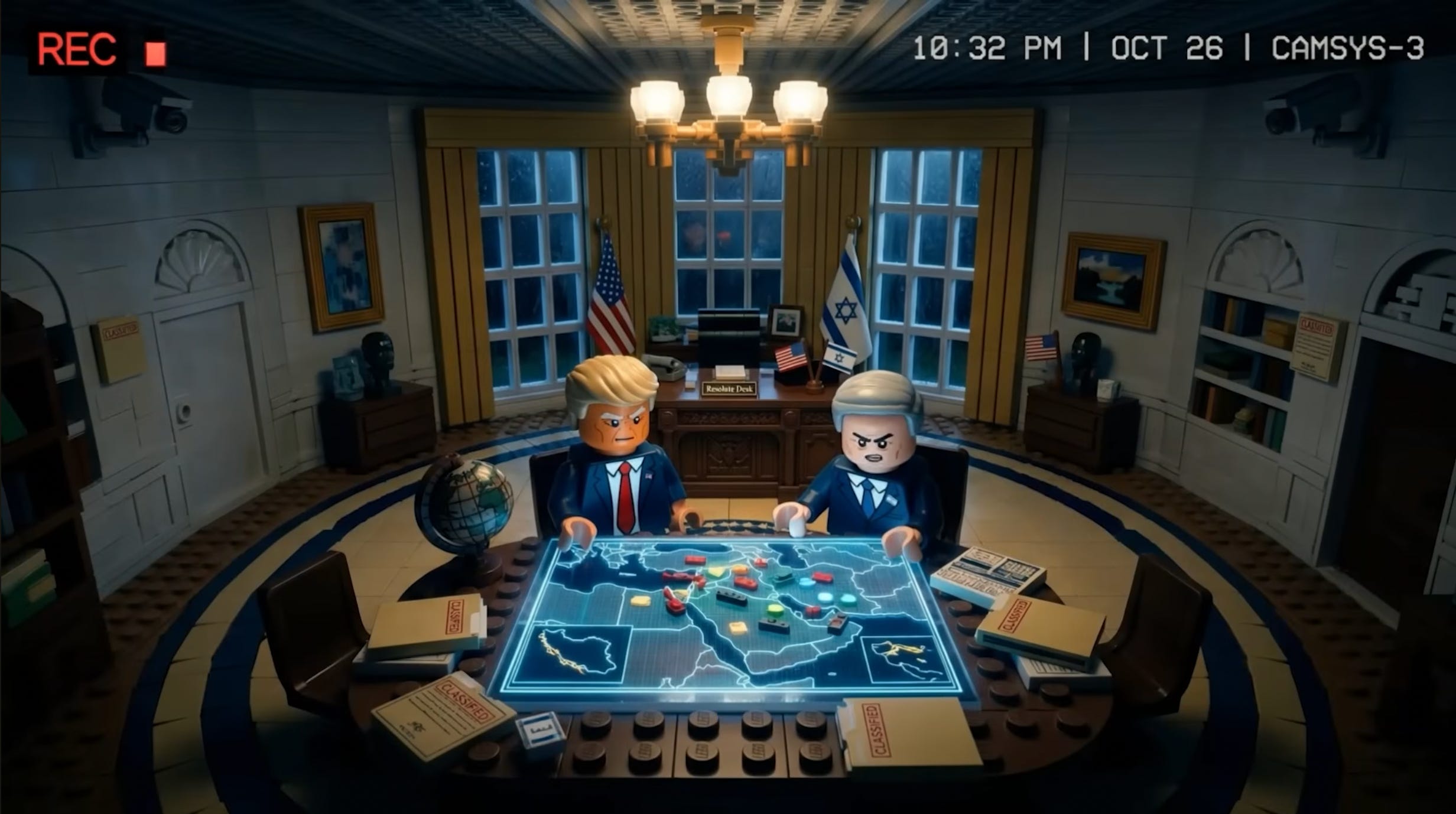 The video looks almost childish at first glance: yellow plastic figures, blocky missiles, a cartoon skyline collapsing into flames. A Lego version of Donald Trump — hair exaggerated, expression frozen somewhere between defiance and panic — paces as the soundtrack builds. Then the scene cuts to explosions, victory graphics, and an ending in which Iran appears to prevail.