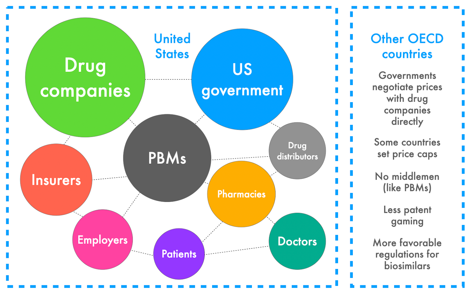 Meanwhile, Pharmacy Benefit Managers (PBMs) represent a strange and uniquely American layer in the US system. These are companies that arose in the 1960s when health insurance companies started covering prescriptions. They are meant to negotiate prices between insurers, drug companies, pharmacies, and in some cases large employers, but critics argue they are monopolistic, overly complex, and incentivized to actually raise prices rather than lower them. PBMs argue that they protect customers and that drug companies are to blame.