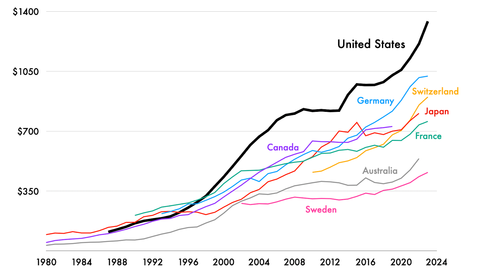 Other research in the late Aughts observed that spending growth started to slow after 2003. They point out that this time saw an increase in drug patent expirations, greater generic drug availability, and overall reduced innovation, among other shifts. This is consistent with the notable flattening of the US price line around 2008 (and even an ever so slight decrease in 2012!) before prices took off again in 2013, at which point there was another surge in new brand-name drugs on the market, this time for hepatitis-C and cystic fibrosis, among other diseases. The passing of the Affordable Care Act in 2010 is also thought to have increased health care spending overall, though it does not alone completely explain the large, and at the time unforeseen, increase in drug prices.