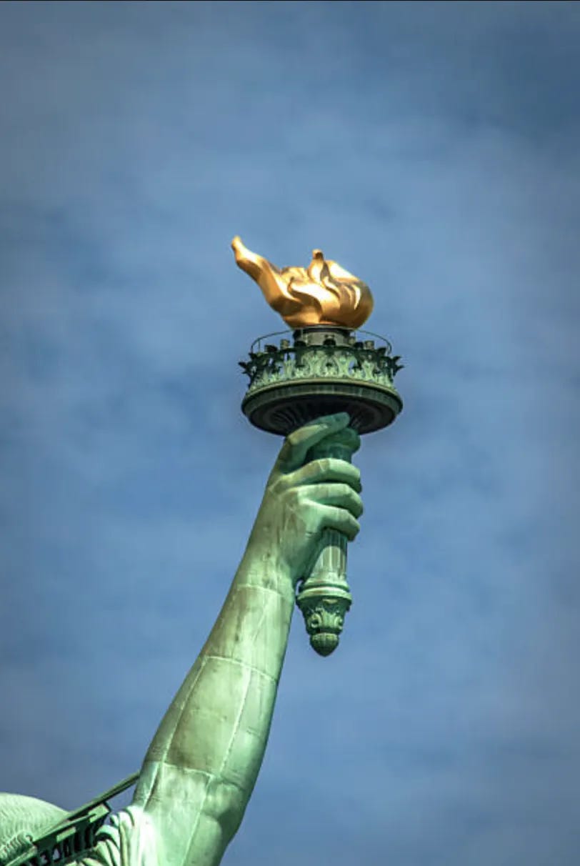 We like to imagine her torch as eternal, but it’s not. It burns only because people before us tended it — people with little to give who still gave it anyway, who sent pennies and poems and belief across oceans.