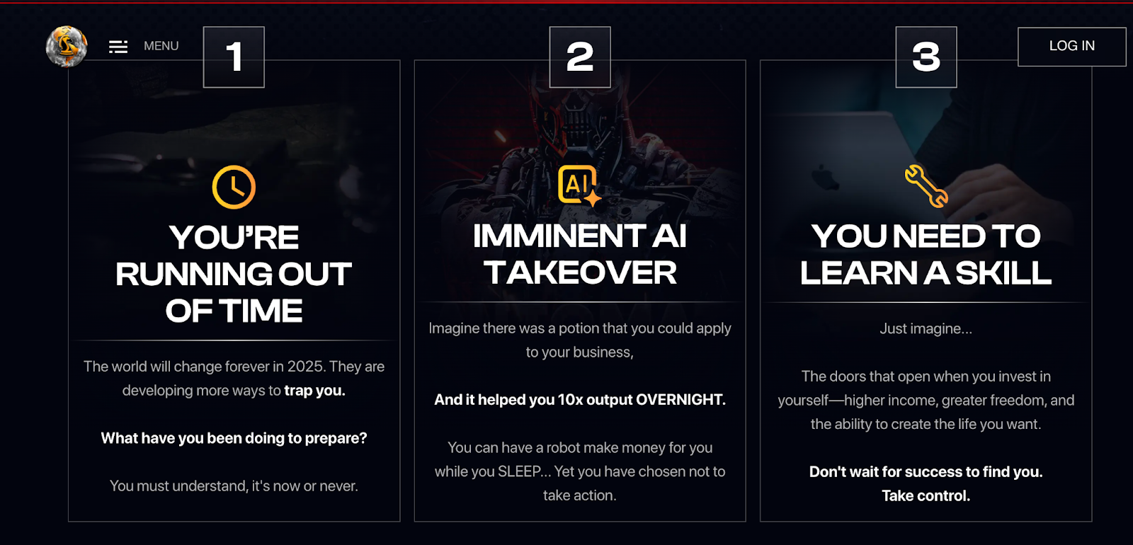 In the words of Andrew Tate, “The matrix may have imprisoned me, but I am free inside The Real World.” The Real World is Tate’s rebrand of his Hustler’s University membership, and the website pushes emotional messaging. You’re running out of time; AI is coming for your job; you, cretin, have chosen not to let the robots make money for you while you sleep. Cue exploding fighter jet. (No, really. A fighter jet crashes into a ball of flame.)