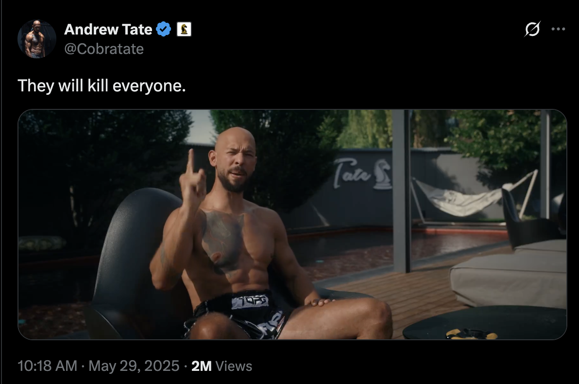 Andrew Tate sits poolside. Shirtless. Tattooed. “This is a political witch hunt. And what they are doing to me is the same thing they tried to do to Trump, and it is the same thing they’re going to do to every single one of you. Do not forget they tried to put a bullet in Trump’s head. And now they want me gone.”