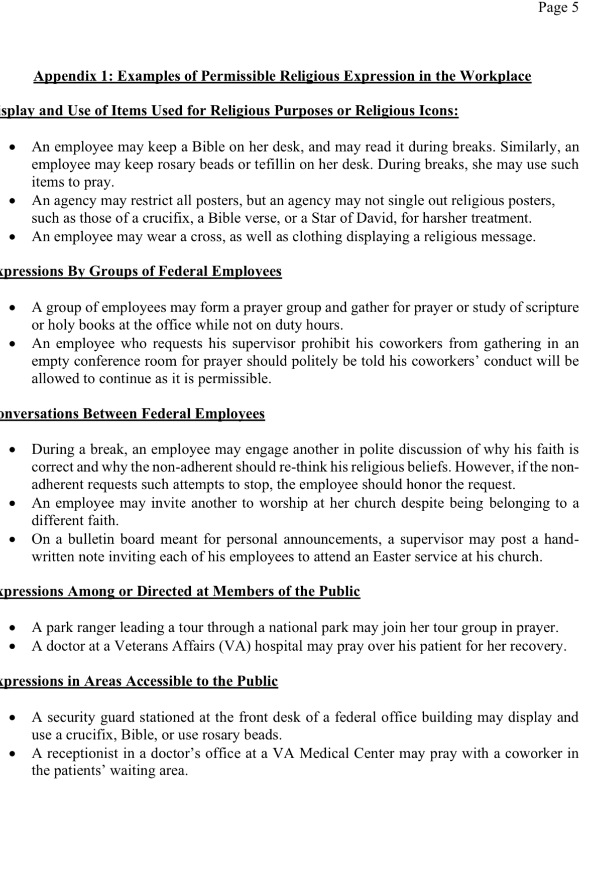 Public-facing workers, such as park rangers and VA doctors, are also told they may pray with hikers or patients, or that they can engage in activities like entering a patient waiting room to pray while on duty.