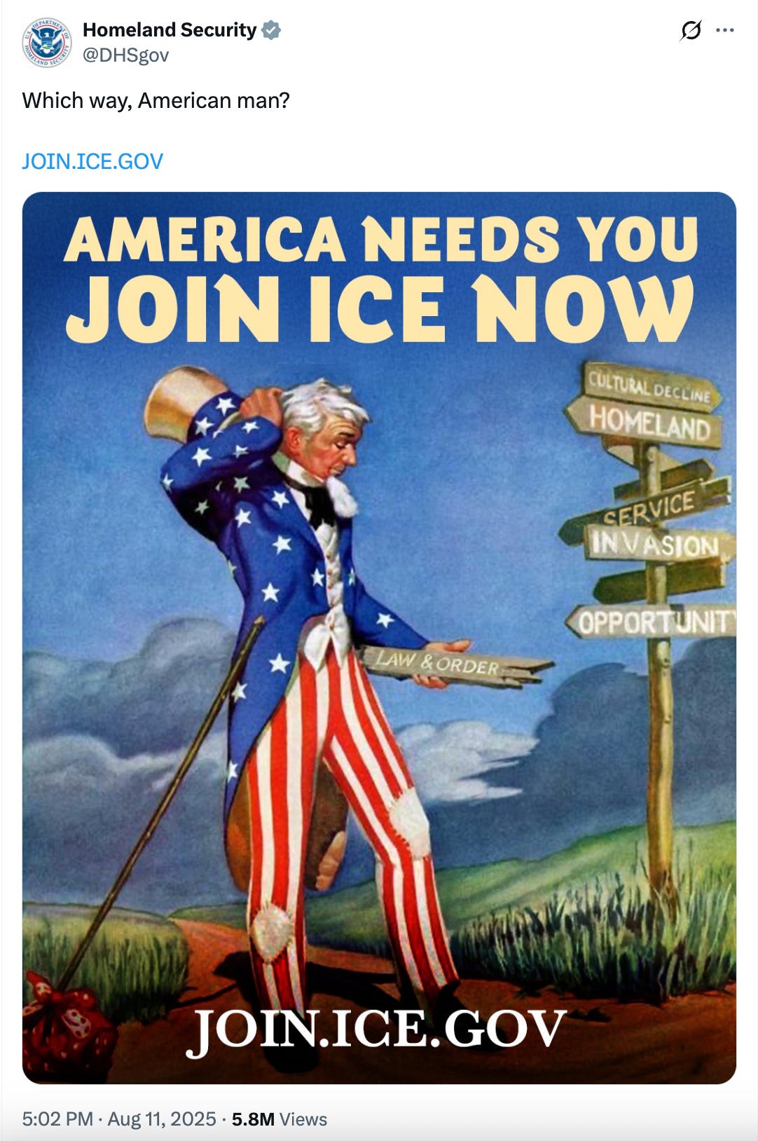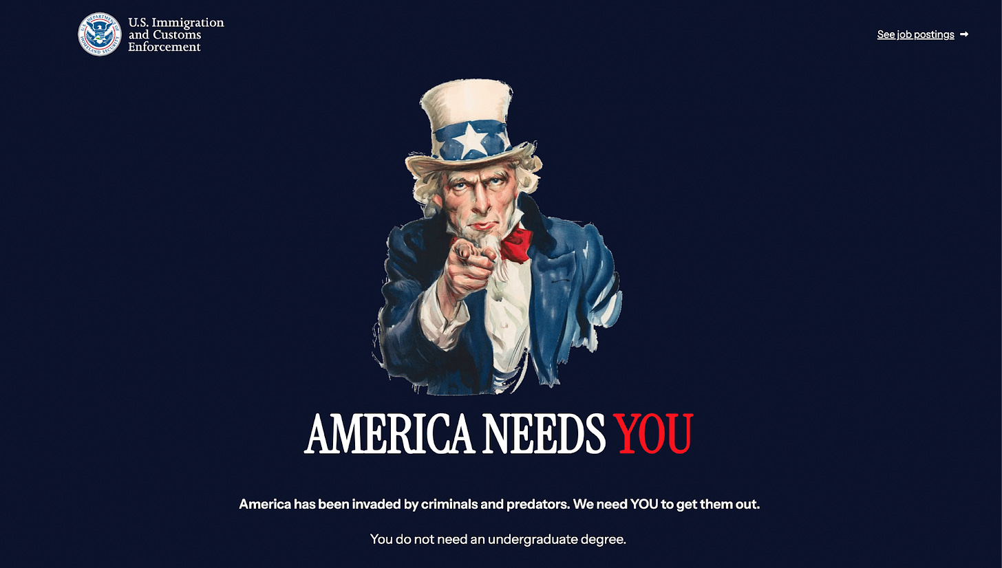 Each post included a link: join.ice.gov. There, a Civil War–era Uncle Sam points at the viewer, intoning: “America has been invaded by criminals and predators. We need YOU to get them out.”
