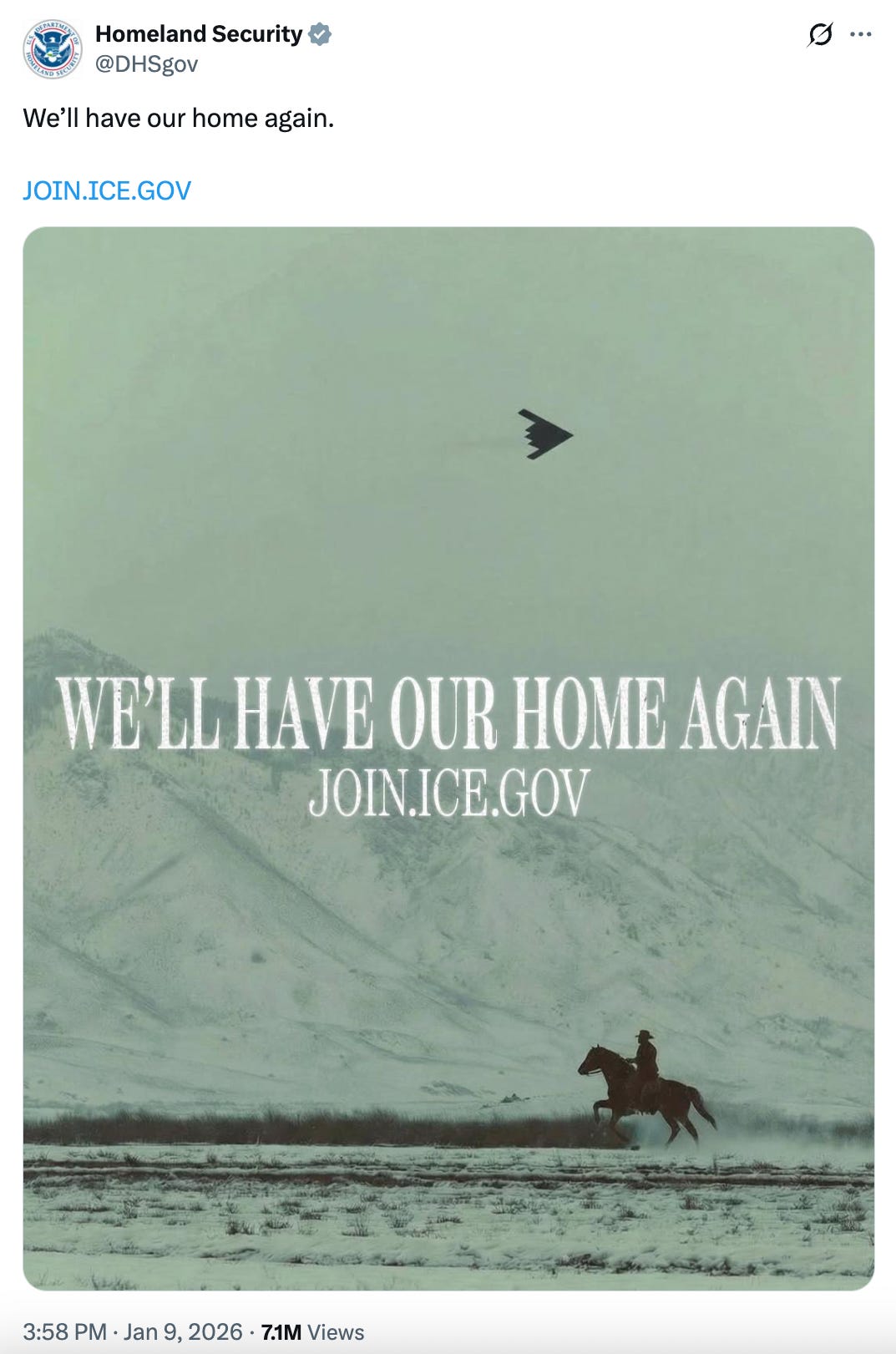 These posts come as the nation grapples with the fatal ICE shooting of Renee Good in Minneapolis. When ICE agent Jonathan Ross shot and killed Good — an incident captured on video showing that Ross had positioned himself in front of Good’s car and that Good was turning away from him as she attempted to leave — the administration’s response was to double down. Homeland Security Secretary Kristi Noem defended Ross, saying he “did follow his training.” Two days later, DHS posted the “We’ll Have Our Home Again” recruitment video.